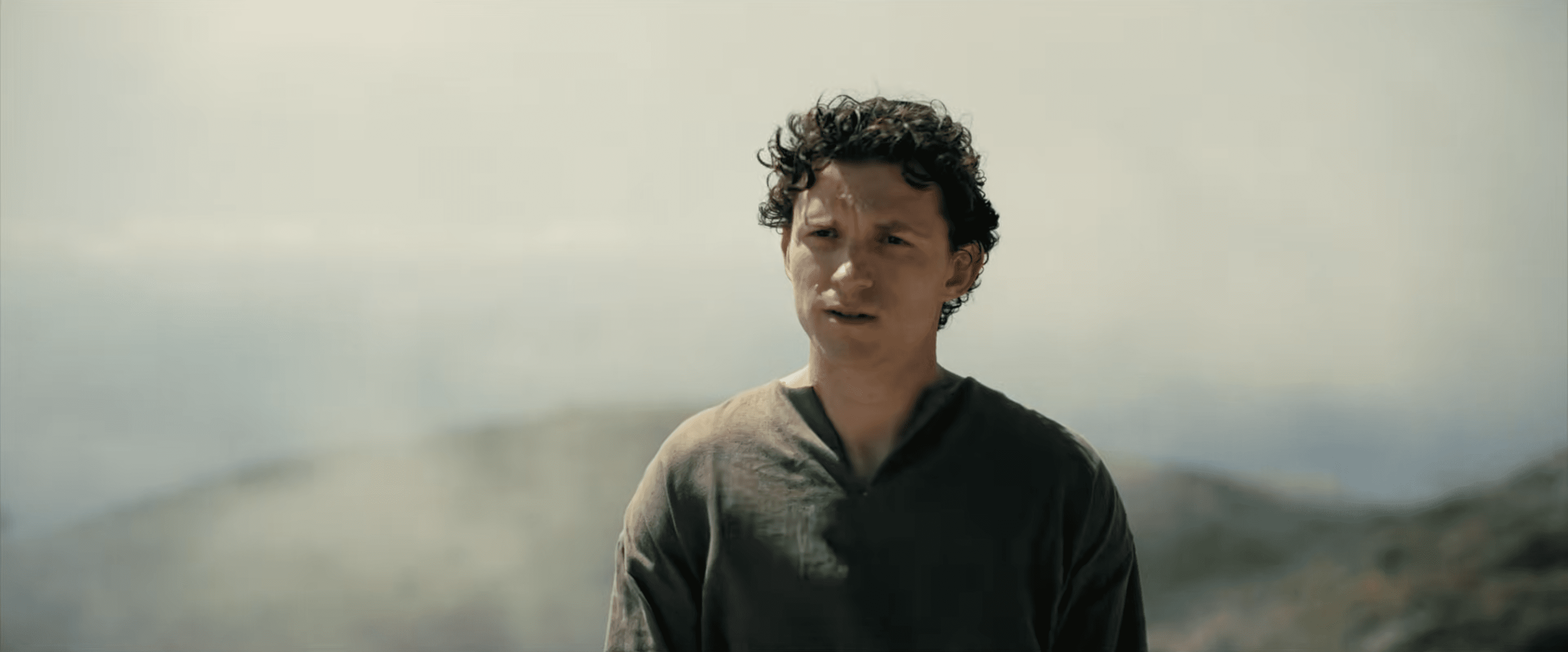 We then meet Tom Holland as Telemachus, no longer the boyish Spider-Man but a prince forged in the fire of his father’s absence. His determined gaze speaks volumes; this is a performance of quiet resolve, a son setting out to find a ghost. Anne Hathaway’s Penelope watches, her concern a silent anchor of emotion back in Ithaca. With just a few shots, the trilogy of the family—father, son, wife—is powerfully established, providing the emotional spine around which the odyssey will twist.