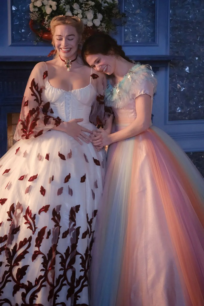 “This Cathy would not be a pared-back brunette drifting through the moors in muted frocks,” the production notes suggest. Instead, Robbie’s Cathy is an “exuberant blonde” rocking Elton John-style sunglasses and German milkmaid corsetry.