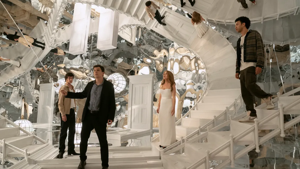 The film’s focus is initially on three young magicians—Charlie (Justice Smith), Bosco (Dominic Sessa), and June (Ariana Greenblatt)—who have been inspired by the Four Horsemen’s Robin Hood-style methods of stealing from the rich and corrupt. They meet one of their inspirations in the flesh when Jesse Eisenberg’s J. Daniel Atlas recruits them to help him nab an incredibly valuable diamond from Veronika Vanderberg (Rosamund Pike), a powerful CEO using her company to fund criminal activities.